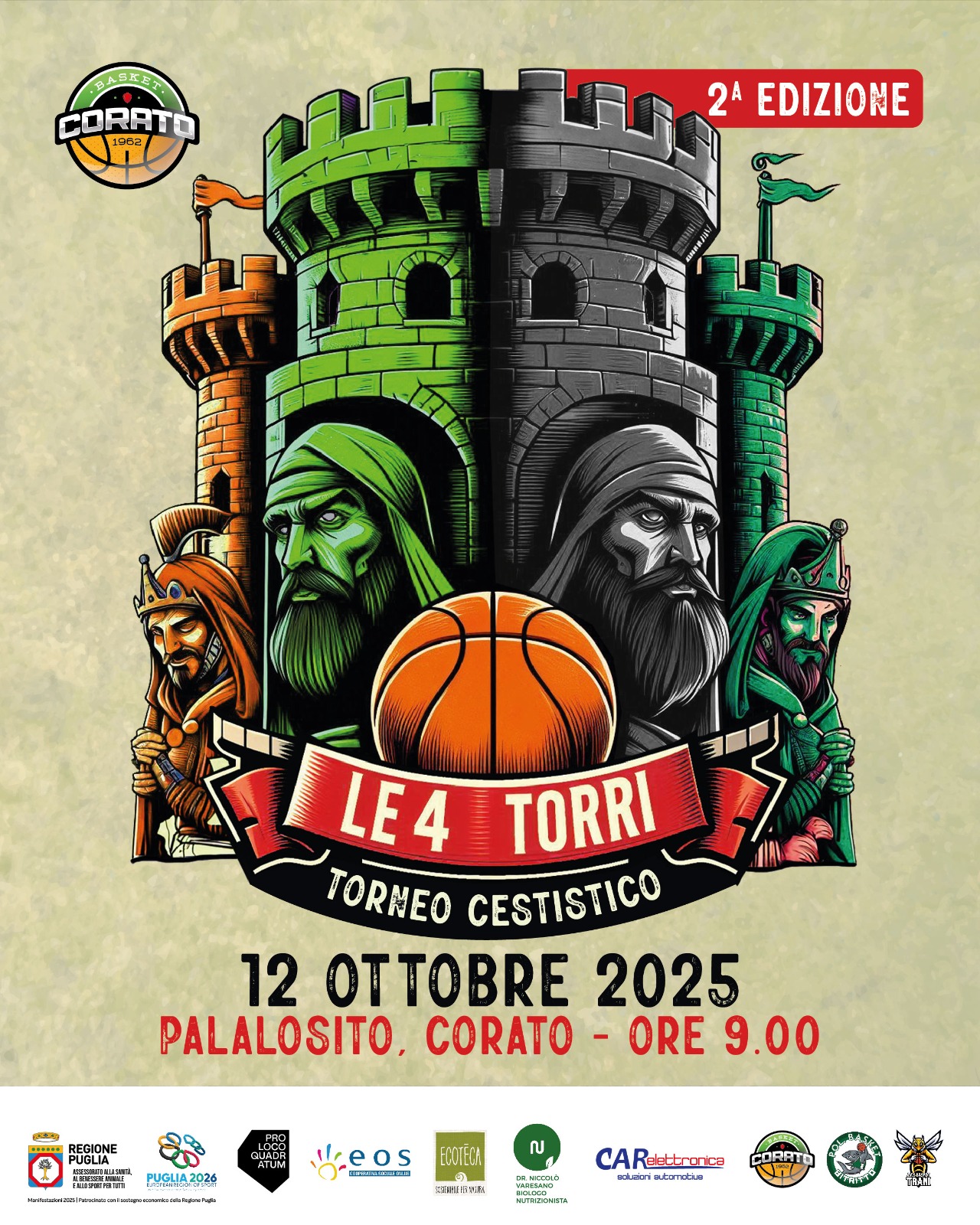 Dopo il grande successo dello scorso anno, alla sua prima edizione, torna anche quest’anno il “TORNEO CESTISTICO LE 4 TORRI”, evento targato Basket Corato che vuole veicolare la promozione del basket, l’inclusione sportiva in età giovanile ed il sano divertimento.